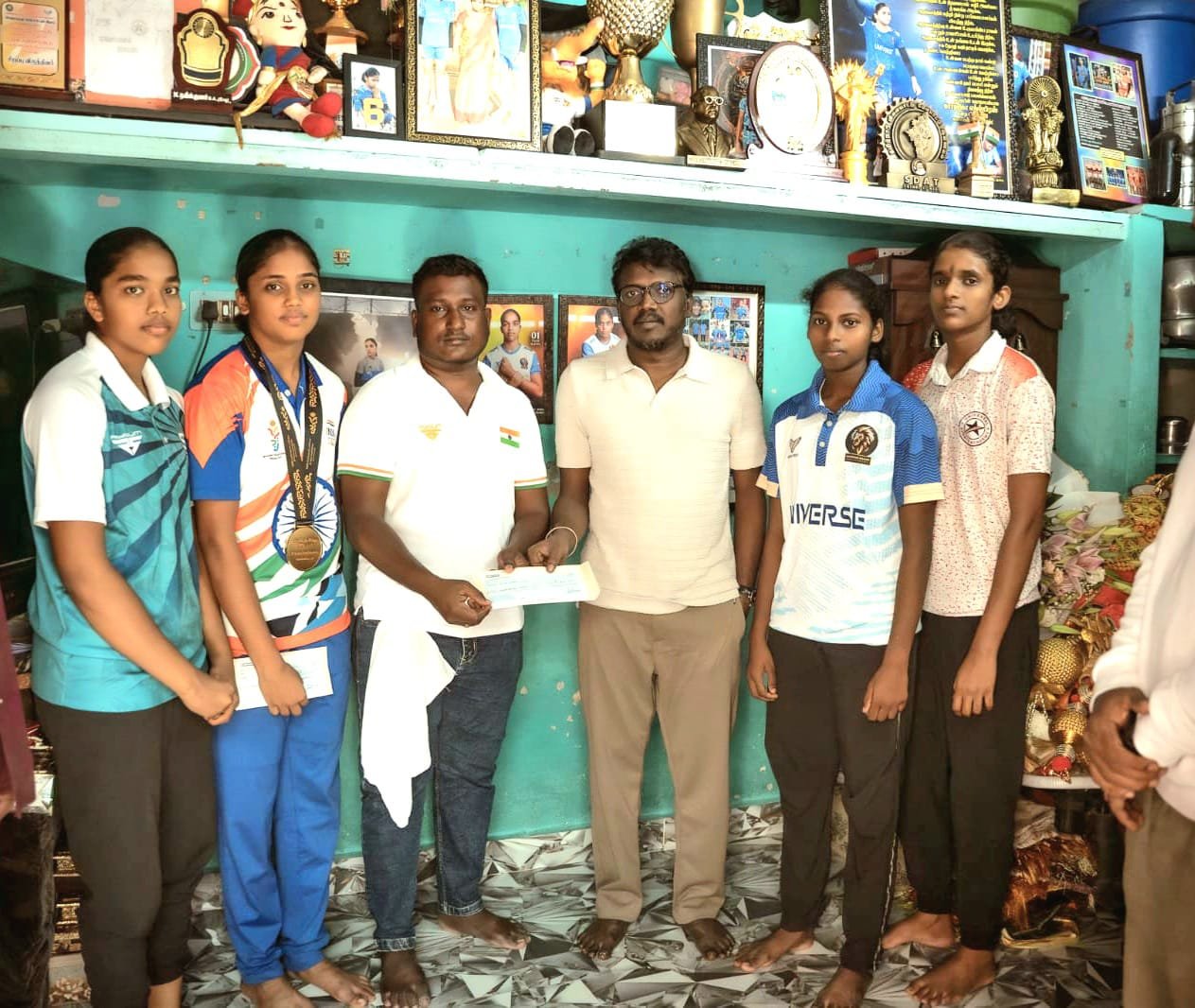 கார்த்திகாவிற்கும் , குழுவிற்கும் காசோலைகள் வழங்கினார்.